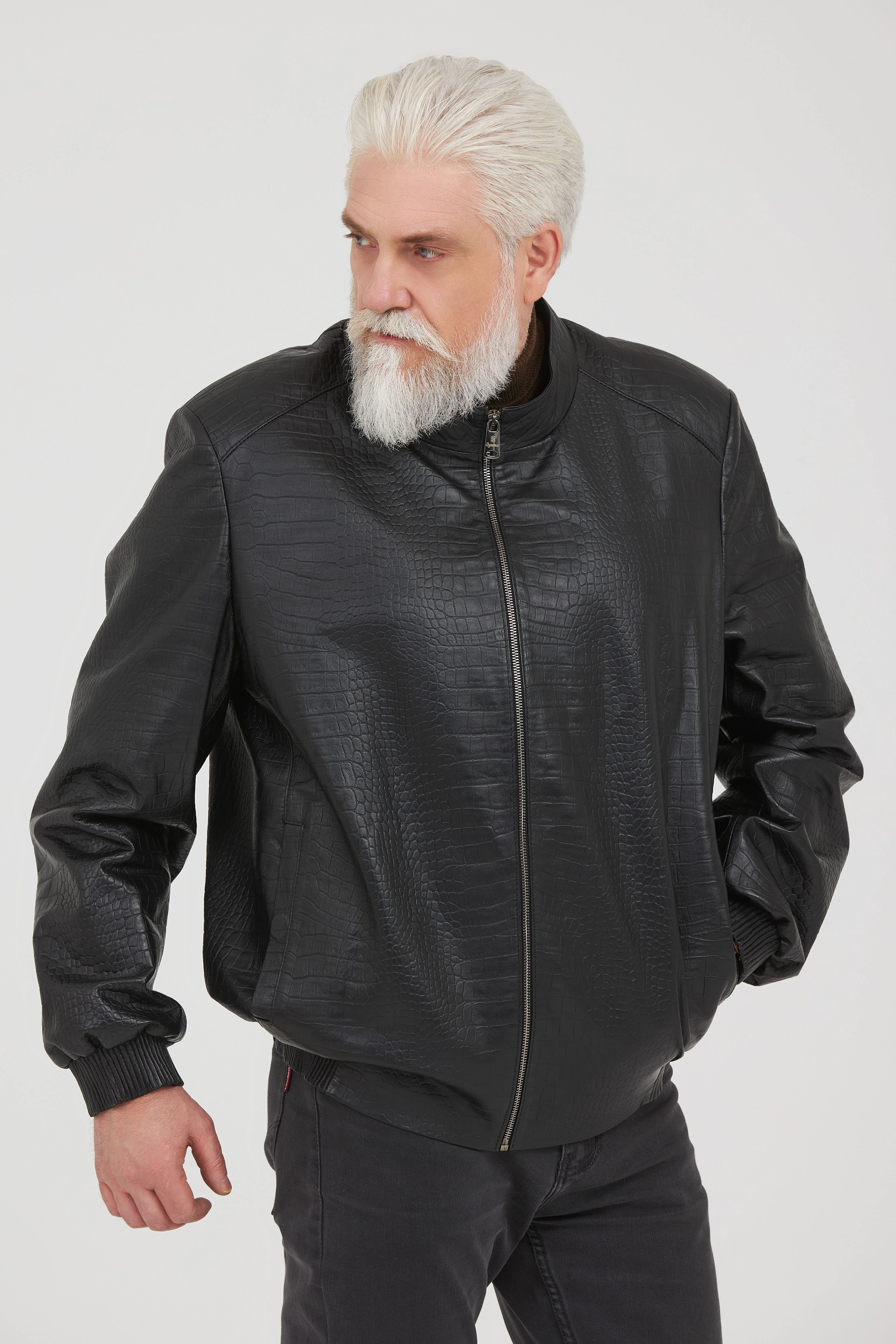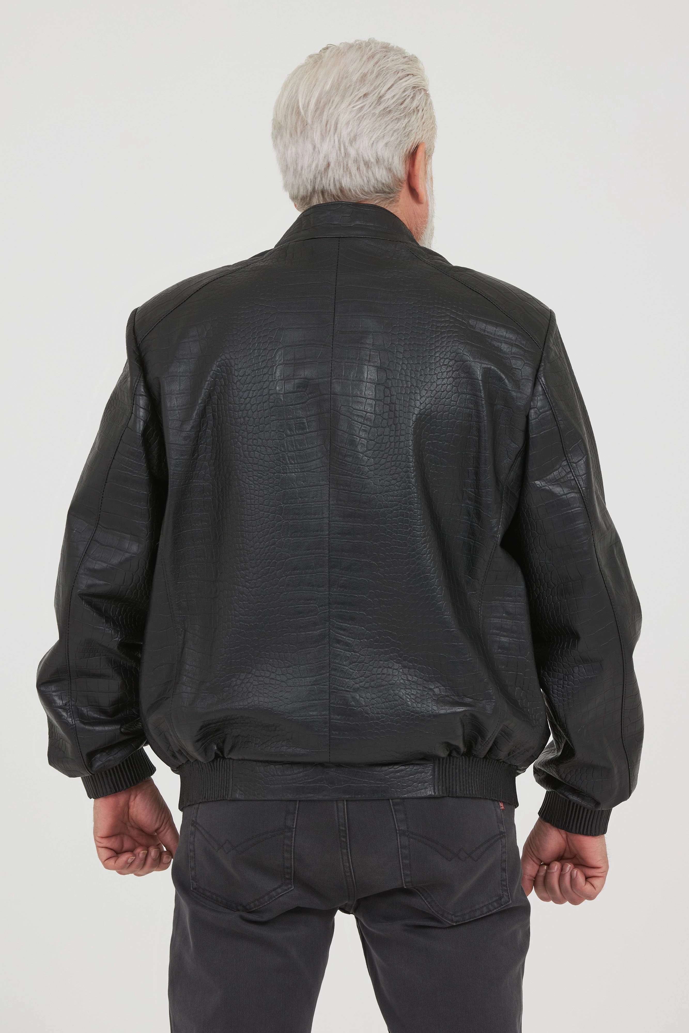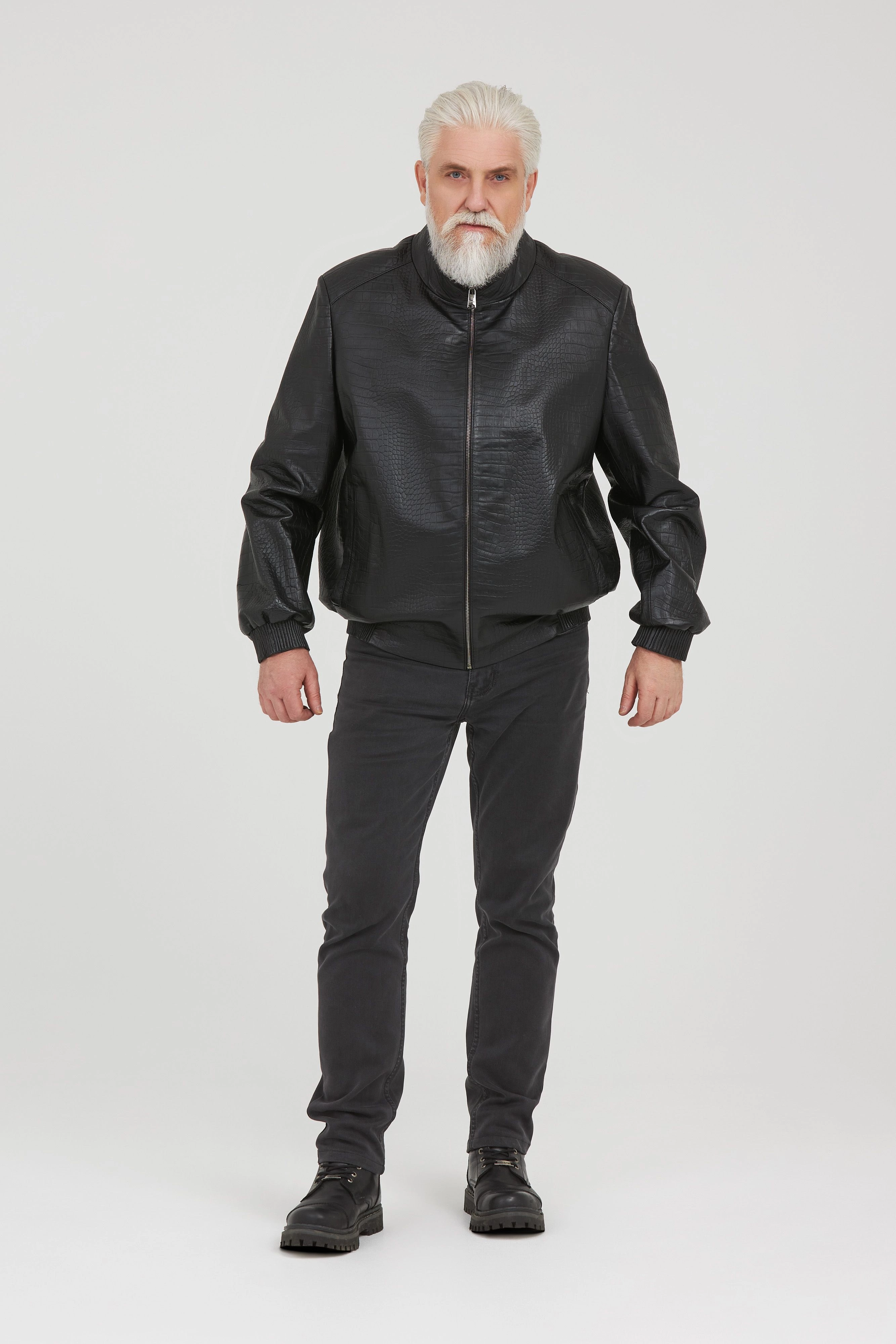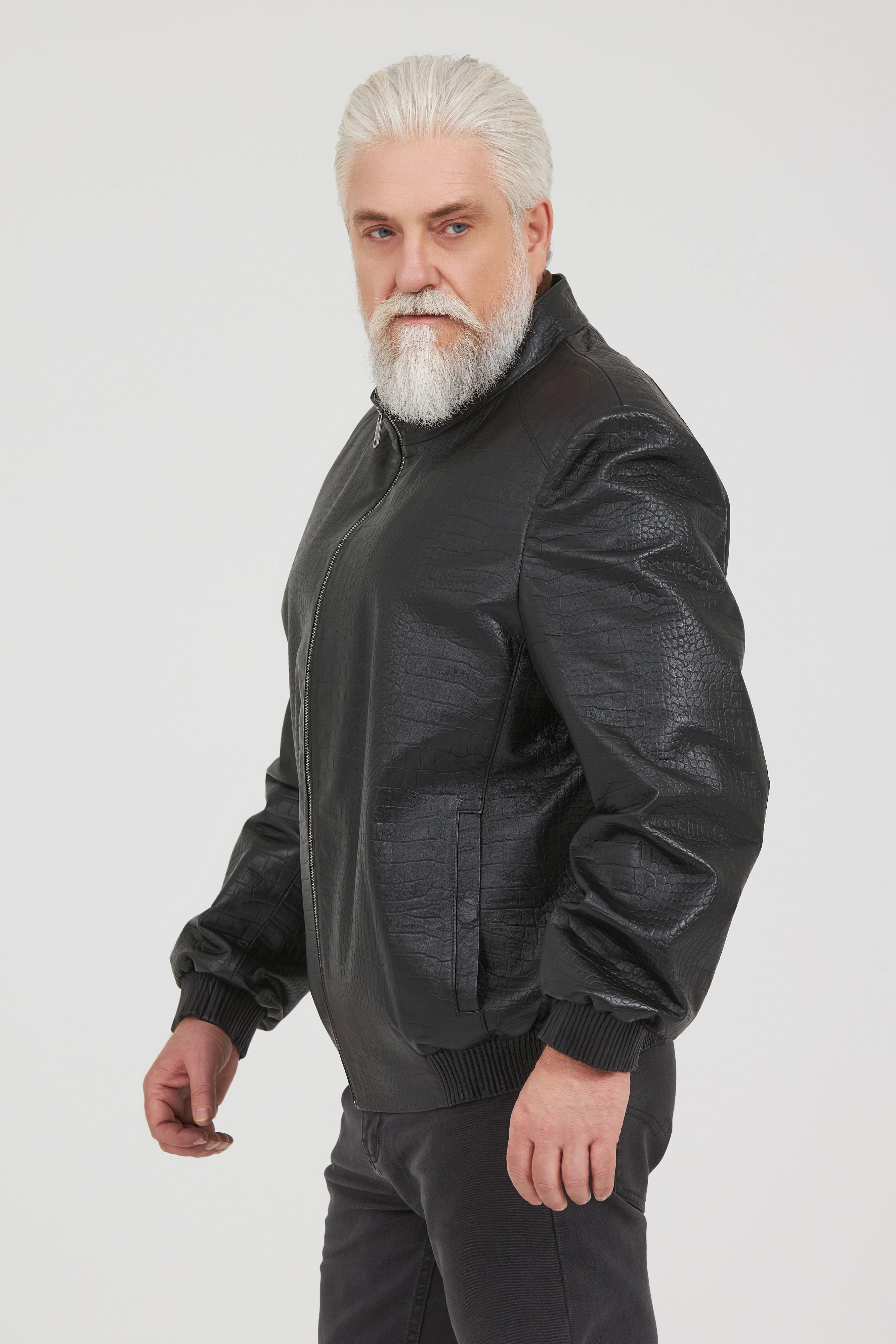 Классическая кожаная куртка из натуральной итальянской кожи, текстура «под рептилию».   Идеальный выбор для мужчин, которые хотят выглядеть стильно и модно. Черный цвет, оптимален под любой образ и сочетается со всеми предметами гардероба. Модель прекрасно впишется в деловой образ и будет комфортно для тех, кто за рулем.